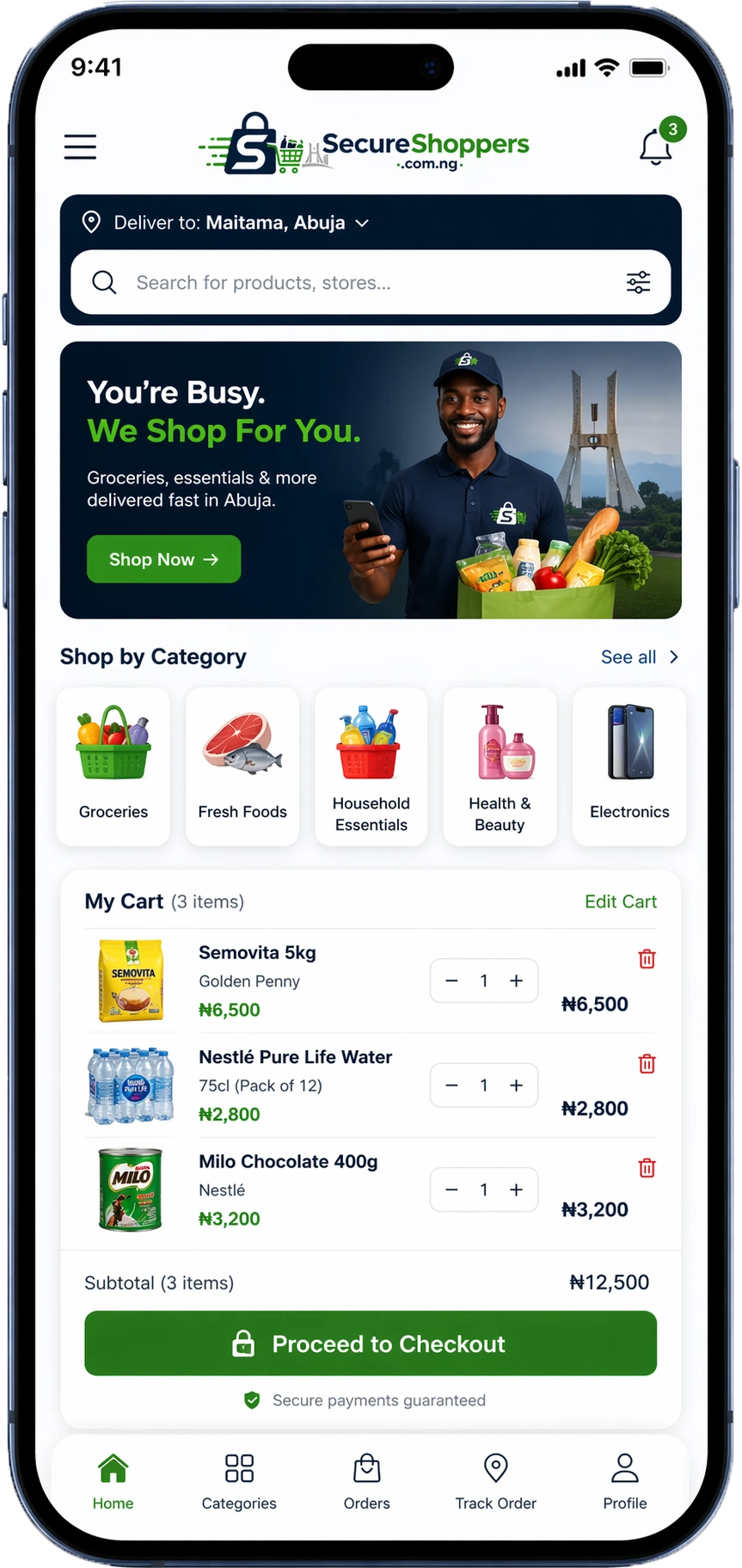 SecureShoppers sends a trusted personal shopper to the market or mall on your behalf. Fresh groceries, branded items, and anything you need, delivered fast to your door.